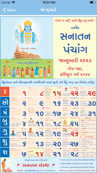 واحدة من الميزات الفريدة لهذا التقويم هي التيثي المفصلة ، التي تدمج نظامي الأمافاسيانت والبورنيمانت للبانشانج. يترافق معلومات التيثي باللغة الجوجاراتية مع مربع التاريخ في التقويم. بالإضافة إلى ذلك ، يتضمن التقويم صورًا عالية الدقة لآلهة وآلهات الهندوس لكل شهر ، مما يضيف لمسة إلهية إلى حياتك اليومية.
